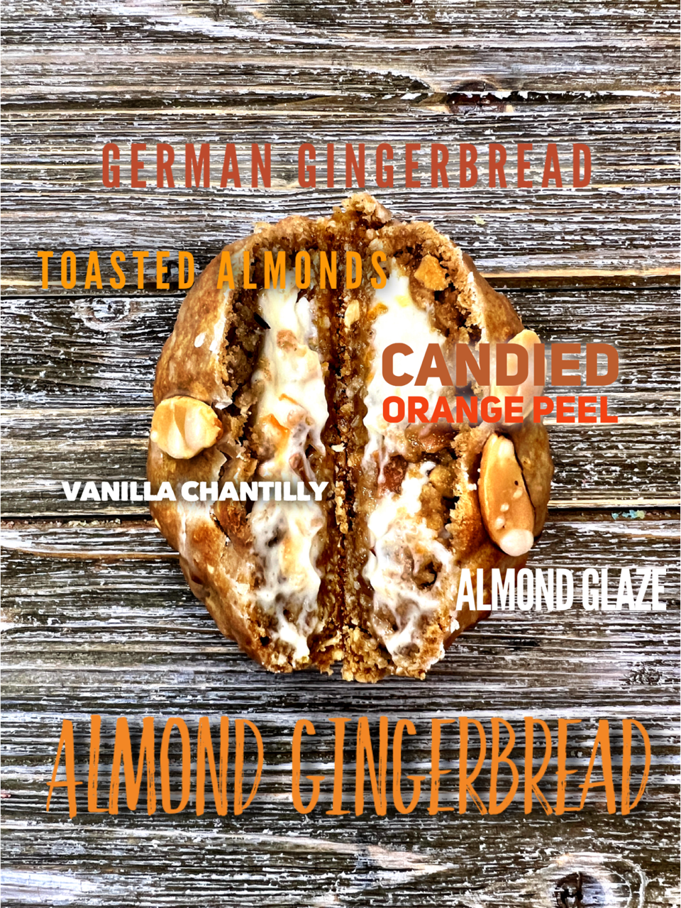 A German Gingerbread cookie with Toffee and Almonds, stuffed with Vanilla Cream and Candied Orange Peel, topped with Almond Glaze. A Christmas classic! (seasonal)